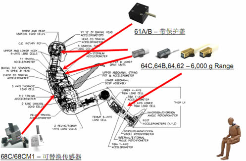 汽車碰撞測(cè)試實(shí)驗(yàn)中假人身上都需要哪些加速度傳感器?假人身上的加速度傳感器的安裝位置是什么樣的?