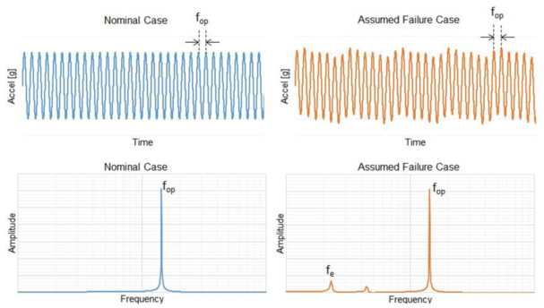 假設fop為機械系統(tǒng)(比如旋轉電機)的工作頻率,fe為系統(tǒng)的錯誤/故障模式頻率(圖3)。在此例中,fe低于fop并且在該圖中顯示,也就是說,由于機身松動,電機正在緩慢振動。對于傳統(tǒng)加速度傳感器,為了檢測這種故障模式,人們需要用MCU/DSP進行頻率分析。而MCU/DSP一直保持工作狀態(tài),會導致額外的內存空間需求以及更高的功耗。