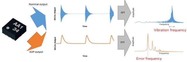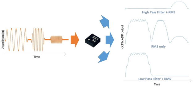 現(xiàn)實世界中的加速度信息(左)由不同頻率和振幅混合而成,KX13x的ADP不僅可以捕獲這些信息,而且能夠輸出指定頻率范圍內的加速度振幅(右側列舉了各種情況示例)。