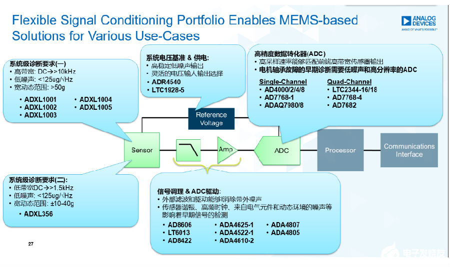ADI除了MEM加速度傳感器,還可以在整個(gè)信號采集信號鏈上提供完整解決方案: