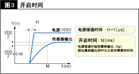 「開啟時間」是指接通電源后,在元件變?yōu)镺N狀態(tài)之前所需耗費的時間。圖3即是用圖表形式來表示到達(dá)最終輸出的99%之前所需要的時間。
