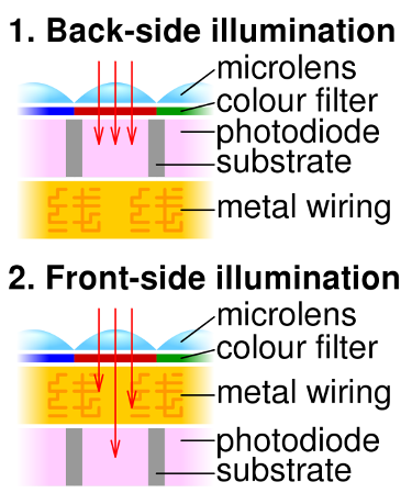 背面照明(BSI或BI)提供了一種有趣的選擇,因為控制電子設備不會限制光敏區(qū)域。但是,光以較低的量子效率(到達傳感器的光子數(shù)與在終端收集的電荷載流子數(shù)之比)進一步傳播。下圖說明了背面和正面照明。