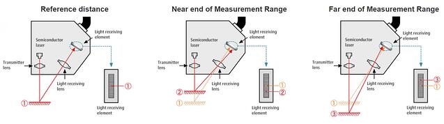 激光位移傳感器將三角測量與發(fā)射和接收透鏡配合使用。激光束通過透射透鏡射向目標(biāo)。然后,光反射回傳感器,并由接收器透鏡導(dǎo)向接收元件。隨著目標(biāo)越來越近,反射光的角度會(huì)發(fā)生變化(聚焦在接收元件上的不同位置)。位移傳感器在防止使用加速度計(jì)(例如旋轉(zhuǎn)部件)或加速度計(jì)的質(zhì)量會(huì)對(duì)系統(tǒng)運(yùn)動(dòng)產(chǎn)生太大影響的應(yīng)用中是首選。