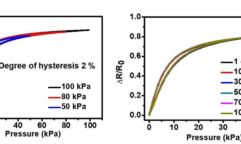 圖2.在不同壓力水平(左)和經(jīng)過不同循環(huán)次數(shù)(右)后,傳感器的磁滯回線。圖片來源:韓國科學(xué)技術(shù)高等研究院(KAIST)
