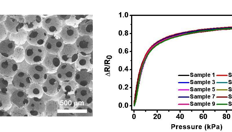 圖1.具有均勻孔徑和形狀的多孔彈性體模板的圖像(左),該圖顯示了傳感器性能的高度均勻性(右)。圖片來源:韓國科學(xué)技術(shù)高等研究院(KAIST)