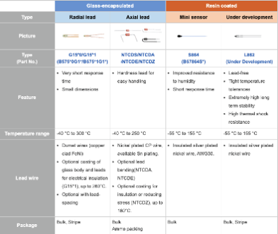 環(huán)氧樹脂涂層的NTC元件結(jié)構(gòu)堅(jiān)固,測量溫度通常在-55°C至+ 155°C之間,而玻璃封裝的NTC元件的測量溫度最高可達(dá)+ 300°C。對(duì)于需要極快響應(yīng)時(shí)間的應(yīng)用,玻璃封裝的元件是更合適的選擇。它們也更緊湊,直徑小至0.8mm。