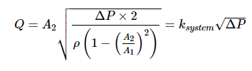 該方程將流體速度(V2)與壓差和管道尺寸相關聯(lián),F(xiàn)在,我們可以將流體的體積流量(Q)計算為:
