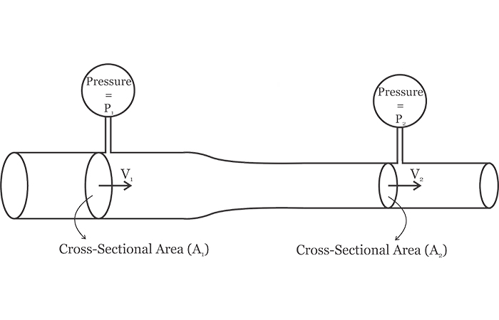 根據(jù)質(zhì)量守恒定律,質(zhì)量既不能創(chuàng)造也不能破壞。經(jīng)典力學中的這一原理以及有關流體流動的一些假設可以幫助我們將流體通過的橫截面積(A)與流體速度(V)相關聯(lián)。考慮流體通過橫截面變化的管道的穩(wěn)定流動,如圖2所示。