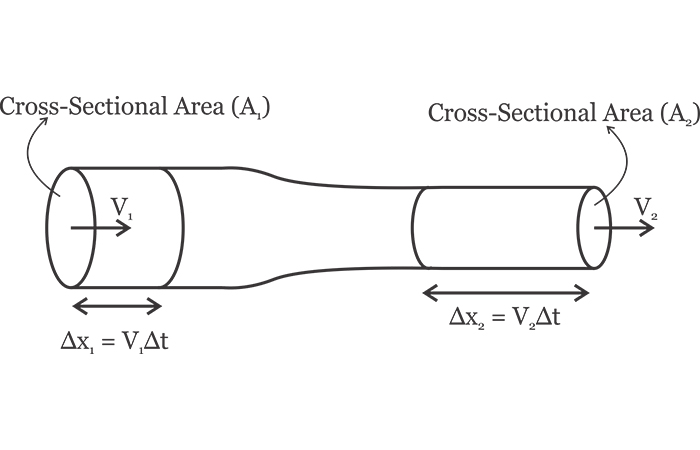 假設流體以的速度進入管道的左端V1。超過橫截面積的流體顆粒A1 將會經(jīng)過 Δx1 一小段時間后Δt。