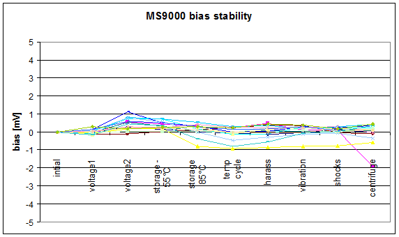 對于量程為±10g的測量,它們總的長期零偏穩(wěn)定性優(yōu)于7.5mg,對于量程±5g,優(yōu)于3.75mg,其標度因數(shù)重復(fù)性優(yōu)于400ppm。圖1顯示了對于各種量程MS9000.D的一年零偏穩(wěn)定性的測量結(jié)果。該分析結(jié)果還包括:在85°時進行10天的加速老化實驗,這對應(yīng)于18個月的標準壽命時間,以及對加速度傳感器為期0.2毫秒,1000g的從六個方向進行的沖擊。