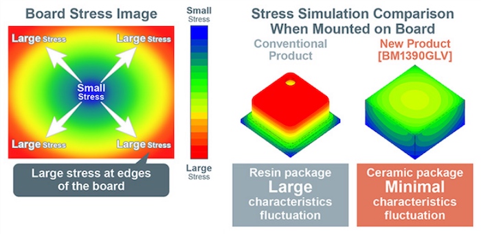 BM1390GLV 采用陶瓷封裝,可大限度地減少安裝應(yīng)力造成的誤差。下圖顯示了用于新型傳感器的陶瓷封裝和傳統(tǒng)傳感器常用的樹脂封裝的應(yīng)力模擬。