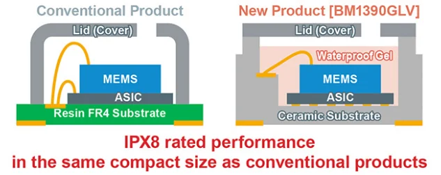 BM1390GLV 中使用的 MEMS 和控制電路可能與其他類似產(chǎn)品沒有太大區(qū)別;但是,新傳感器采用專有結(jié)構(gòu)和特殊防水凝膠,可用于需要防水性能的工業(yè)設(shè)備和家用電器。