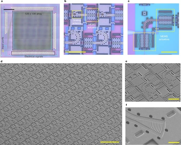 由此產(chǎn)生的設(shè)備在 1 平方厘米的固態(tài)芯片上創(chuàng)建了 128x128 像素陣列。研究人員聲稱,該芯片上的 16,348 像素遠遠超過了之前達到的數(shù)量,使其成為市場上分辨率的固態(tài) FPSA 芯片。