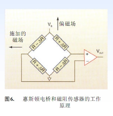 惠斯頓電橋是磁阻傳感器的基礎電氣元件。圖5說明了磁阻傳感器的工作原理和一個MR板對外部磁場的典型響應。圖6所示為用四個磁控電阻器制成的惠斯頓電橋帶有一個供電電壓Vb,致使電流通過電阻器。如圖所示,施加一個偏磁場,使在所有電阻中的磁化強度和電流間有一個約45°的夾角。如果電阻器是同一種結構,則所有四個電阻器的電阻是相同的,正交施加磁場h的R.A,使兩個反向放置的電阻器磁化而轉向電流,使電阻有一個增量△R,在剩下的兩個反向放置的電阻器中,由于磁化而轉離電流,導致電阻減少△R 。