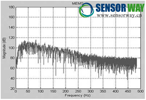 從圖中可明顯看出,壓阻式傳感器采集到的振動信號比動圈式采集到的振動信號內(nèi)容豐富,后者有明顯的信號丟失,而前者的信號幅度在環(huán)境等同條件下明顯增強(qiáng)。雖然作為無源傳感器的機(jī)械動圈式傳感器具有 低噪聲的特點,但壓阻式的信噪比要比動圈式大的多,達(dá)6dBv,后面的幅頻特性對比曲線將說到這一點。