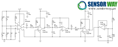 在本電路中,RS1、RS2、RS3和RS4是光刻在MEMS懸臂梁上的四可變電阻;R*是零位調(diào)整電阻;儀表放大 器AD620和C2組成前置級交流放大器,放大原始信號;AD708是高精度雙運放芯片,IC2/A和R2、R3組成 反相比例放大器,目的是調(diào)準(zhǔn)中間級放大倍數(shù);IC/2B和R4、R5、C4、C5組成多路反饋、壓控、二節(jié)低通 有源濾波器,濾除高頻干擾波;IC/3A和R7、R8組成反相比例放大器,調(diào)整整個電路的輸出,也稱滿足刻 輸出。因為該套電路要和計算機(jī)接口,需要設(shè)計中心電壓,本設(shè)計的中心電壓為1.65V,IC3/B和R9、R10 組成跟隨電壓穩(wěn)壓電路,使IC3/B運放輸出電路接口電位為1.65V,從而保持整個電路的中心電壓為1.65V。