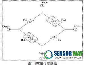 VA系列巨磁電阻磁傳感器采用惠斯通橋式結(jié)構(gòu),如圖1所示的。圖中,R1和R3是兩個阻值一樣的電阻,可隨外界磁場的變化輸出一個差分電壓信號,R2和R4由于屏蔽層的作用不感應(yīng)外界磁場的變化。