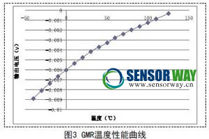 將GMR芯片放入高低溫?zé)o磁溫度箱中,每隔10℃記錄一次數(shù)據(jù),監(jiān)測傳感器從-40℃~+125℃隨溫度變化的漂移性,具體如圖3所示,芯片在整個溫度范圍內(nèi)輸出變化9.075mv,溫度系數(shù)為0.055mV/℃,可見GMR傳感器芯片的溫度性能比較優(yōu)越。