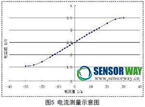 在實際應(yīng)用中,待測電流有正負之分,產(chǎn)生的磁場有正負之分,因此,在測試過程中,通過改變磁場方向和電流的方向來檢測GMR傳感器和電流傳感器測試性能。圖5是電流從-30A到+30A變化時電流傳感器輸出曲線。