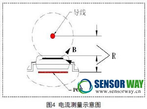 巨磁電阻用于電流檢測一般采用如圖4所示的方式進行,將磁傳感器放置通電導(dǎo)線的正上方或正下方,同時保證通電導(dǎo)線產(chǎn)生磁場的方向與磁傳感器的敏感方向一致。按照通電導(dǎo)線周圍產(chǎn)生磁場的理論計算公式2-1可知,在待測電流和傳感器相對位置一定的情況下,待測電流的大小和磁場大小成正比,利用公式2-2這樣就可以直接測量待測電流產(chǎn)生的磁場值,再結(jié)合公式2-1就得出待測電流的大小。