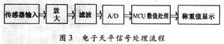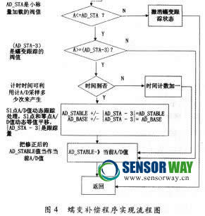 式(1)是加載到S1點天平的稱重值;式(2)是加載穩(wěn)定到S1點和進行蠕變補償后天平的稱重值,式中載荷蠕變和受加載影響天平零點蠕變值同是ε。?蠕變跟蹤補償?shù)年P(guān)鍵是判斷和確定圖1所示的S1點、蠕變量ε與時間的關(guān)系,然后根據(jù)這一關(guān)系進行蠕變補償。補償思路見圖4.圖4的前半段是確定S1點,后半段是蠕變跟蹤處理。這里的關(guān)鍵問題是如何確定蠕變跟蹤量和跟蹤時間的關(guān)系。圖1只定性地說明傳感器的蠕變特性,但是,每個傳感器都有定量的特性,也就是蠕變量ε與時間的關(guān)系。只有確定這一關(guān)系,才能確定蠕變跟蹤時間和跟蹤量(圖4中的AD_STA3)。解決的辦法是在天平標定時一起確定蠕變曲線。具體做法是:加載砝碼標定時按規(guī)程測試蠕變特性,單片機先記錄下S1點,并記錄每隔固定的時間段的當前A/D值與S1點的差值,這就是該段時間的蠕變值。用軟件辦法記錄下這個傳感器蠕變量與時間的關(guān)系,然后再根據(jù)這一關(guān)系確定跟蹤量(AD_STA-3)和跟蹤時間。確定的原則是:固定的時間段蠕變量越大,跟蹤量(AD_STA-3)就越大和跟蹤間隔時間就越小。反之,跟蹤量(AD_STA-3)就越小和跟蹤間隔時間就越大。