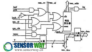 圖3 SRAM高速緩沖區(qū)控制器的CPLD實(shí)現(xiàn)圖3中ram_rd,raM_wr為輸出到SRAM的讀寫信號(hào)線,raM_data,ram_addr為SRAM的數(shù)據(jù)地址總線;latch_f為SRAM的讀寫允許信號(hào),當(dāng)為高電平時(shí)允許對(duì)SRAM寫操作,為低電平時(shí)允許對(duì)SRAM讀操作;兩個(gè)8路三態(tài)門用于隔離總線,當(dāng)對(duì)SRAM寫時(shí),輸出cpu_datA為高阻態(tài),當(dāng)對(duì)SRAM讀時(shí),將采集數(shù)據(jù)信號(hào)Y [7∶M]隔離;cpu_rds,vsync為開始讀寫信號(hào),單個(gè)正脈沖將SRAM地址置0;cpu_rD作為SRAM快速讀脈沖,pclk為SRAM寫脈沖;irq為寫滿標(biāo)志,用于向上提供中斷標(biāo)志;地址發(fā)生器用于產(chǎn)生SRAM地址(IS61C1024有17根地址線)。