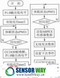 根據(jù)傳感器的操作要求,設(shè)置無(wú)線(xiàn)瓦斯傳感器按照以下的流程進(jìn)行工作。節(jié)點(diǎn)處于工作/休眠交替狀態(tài),一個(gè)工作周期約為10 min.在前8分30秒中CC2430的P1.0引腳輸出低電平,控制MIPEX傳感器不工作。緊接著,CC2430進(jìn)入低功耗運(yùn)行模式。8分30秒過(guò)后,CC2430被喚醒,P1.0引腳輸出高電平,即給MIPEX傳感器供電。此時(shí)CC2430進(jìn)入PM1低功耗模式。由于MIPEX傳感器的熱身時(shí)間為1min,這里設(shè)置70s后,CC2430被喚醒,開(kāi)始讀取MIPEX中的瓦斯?jié)舛刃畔,然后將其無(wú)線(xiàn)發(fā)送出去。待發(fā)送完畢后,設(shè)置下一次瓦斯?jié)舛茸x取事件,周期為20 s,這20 s內(nèi),CC2430自動(dòng)進(jìn)入低功耗模式。20 s之后,觸發(fā)該事件,并送給應(yīng)用層處理,開(kāi)始了上述循環(huán)過(guò)程。程序設(shè)計(jì)的具體流程如圖1所示。