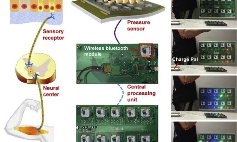 該團(tuán)隊(duì)還設(shè)計(jì)了一個(gè)人工體細(xì)胞反射弧,以模仿生物系統(tǒng)中的反應(yīng)。傳感器安裝在志愿者的肘部。隨著志愿者增加彎曲角度,信號(hào)通過無線藍(lán)牙模塊傳輸?shù)焦δ軉卧,功能單元中的LED點(diǎn)亮量也增加。