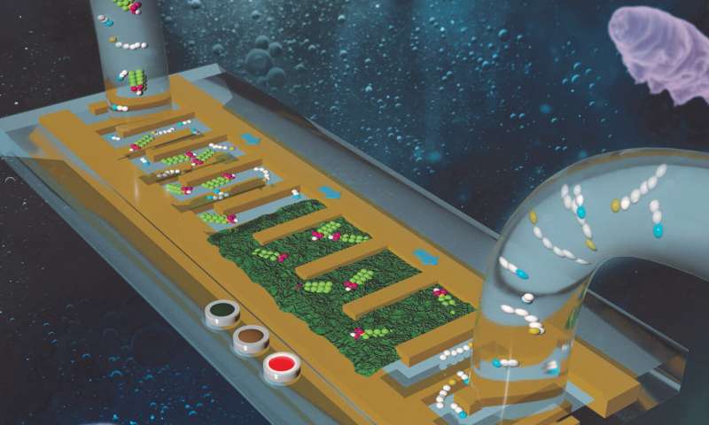 傳感器看起來像一個顯微鏡載玻片,上面有一個曲折的小迷宮。水樣本流過迷宮,并進入中間的海綿狀材料。水樣本中的任何PFOS或PFAS分子都被海綿捕獲,而其他分子則通過。