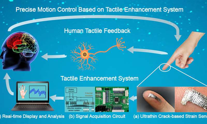 在本周的《應(yīng)用物理評(píng)論》上,科學(xué)家報(bào)告了基于高靈敏度傳感器的新型觸覺增強(qiáng)系統(tǒng)的開發(fā)。該傳感器具有卓越的靈敏度,使佩戴者能夠檢測出羽毛的光筆,花瓣的觸感,落在手指上的水滴,甚至是太細(xì)小的電線都看不到。