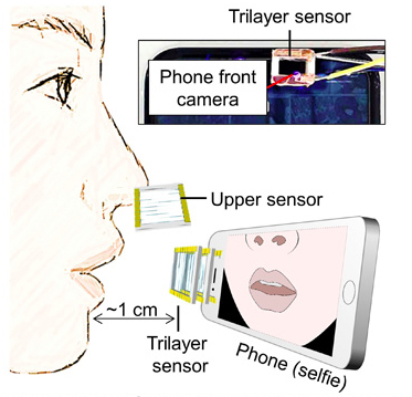 便攜式三層光纖傳感器可以連接到智能手機(jī)的前置攝像頭,將單層光纖傳感器放置在鼻子上方。圖片(修改后)由Science Advances提供
