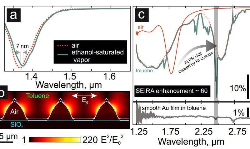 一階晶格等離子體共振(FLPR)的各種應(yīng)用a)由注入飽和乙醇蒸氣引起的納米空隙陣列SP傳感器的光譜響應(yīng)。(b)在2.5μm波長(zhǎng)的線性極化光源從頂部激發(fā)納米空隙陣列的表面附近時(shí),計(jì)算出的平方化歸一化EM場(chǎng)振幅E2 / E2 0靠近甲苯。(c)在空氣中和在甲苯液體層下的納米空隙陣列的FTIR反射光譜。如果不吸收甲苯,則虛線表示納米空隙陣列對(duì)反射光譜的貢獻(xiàn)。底部面板顯示了在相同條件下從被甲苯覆蓋的光滑Au膜表面反射的FTIR反射。
