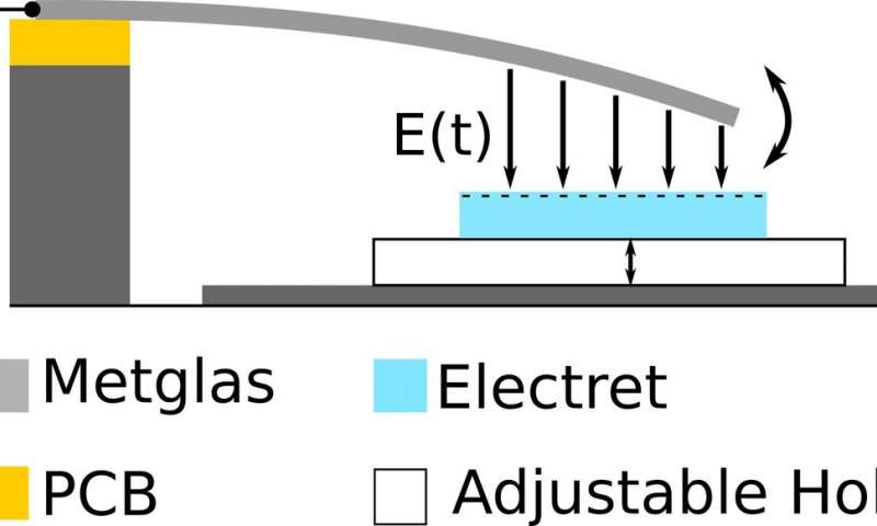 通過施加磁場,彎曲梁振動(dòng)。永久充電的駐極體(藍(lán)色)拉動(dòng)彎曲梁。這樣,他的振動(dòng)力變得更強(qiáng),并且發(fā)出的電信號也更強(qiáng)。學(xué)分:基爾大學(xué)