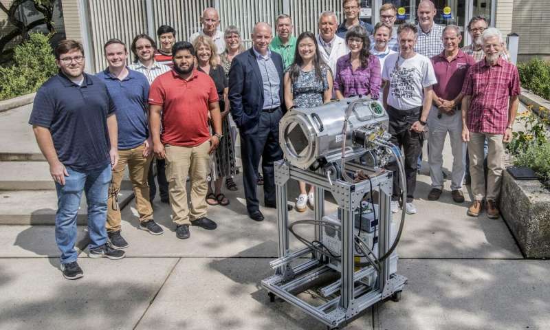 Brookhaven Lab的LSST項目團(tuán)隊的成員將看到一個原型筏低溫恒溫器。除木筏外,布魯克海文的科學(xué)家還設(shè)計并制造了低溫恒溫器,可將木筏固定并冷卻至-100攝氏度。圖片來源:布魯克海文國家實驗室