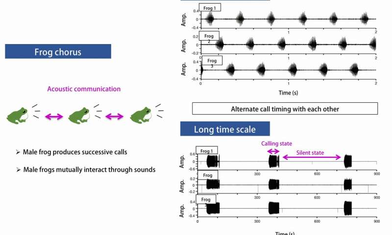 研究小組研究了不同時間間隔內(nèi)雄性日本樹蛙的鳴叫模式。為此,他們將三只青蛙分別放在籠子里,并記錄了它們的聲音相互作用。他們發(fā)現(xiàn)青蛙既避免了重疊的吱吱聲,又在呼喊和沉默之間集體切換。然后,研究人員創(chuàng)建了一個數(shù)學(xué)模型,以使青蛙的聲學(xué)教學(xué)適應(yīng)技術(shù)利益,因為這種模式類似于網(wǎng)絡(luò)中重視的模式。該發(fā)現(xiàn)發(fā)表在《皇家學(xué)會開放科學(xué)》雜志上。