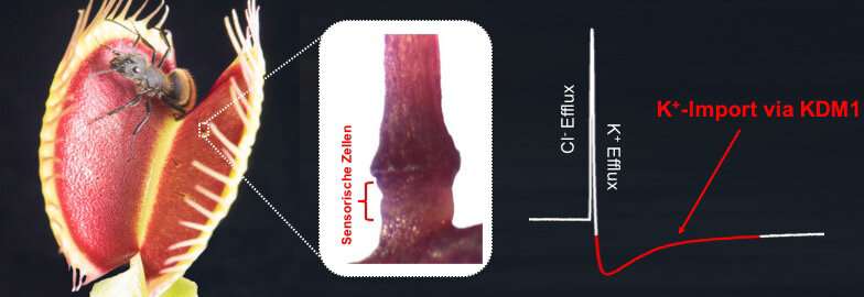 捕蠅草的潛在陷阱。中部:觸發(fā)發(fā)的基部,在觸覺刺激下,感覺細(xì)胞會(huì)誘發(fā)動(dòng)作電位。在動(dòng)作電位的后期,需要通過KDM1將鉀離子重新導(dǎo)入感覺細(xì)胞,以產(chǎn)生連續(xù)的動(dòng)作電位。圖片來源:Ines Kreuzer,Soenke Scherzer /維爾茨堡大學(xué)
