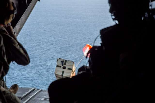 伍茲霍爾海洋研究所的一名乘務員和一名科學家在太平洋上空飛行了數(shù)千英尺,將一架美國海軍陸戰(zhàn)隊MV-22魚鷹式飛機的圓柱狀浮標扔了起來。裝有數(shù)據(jù)收集傳感器以測量水下狀況,浮子在打開橙色降落傘以緩解飛濺之前迅速墜落。
