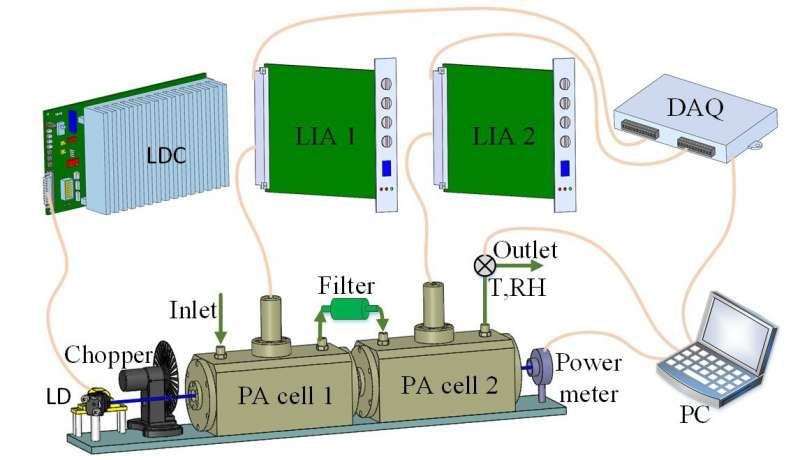 研究小組成員劉Kun教授解釋說:“該PAS(D-PAS)基于443 nm激光二極管! “通過優(yōu)化聲諧振器的結(jié)構(gòu),我們實現(xiàn)了在線測量氣溶膠吸收和NO 2的高靈敏度和大流量!