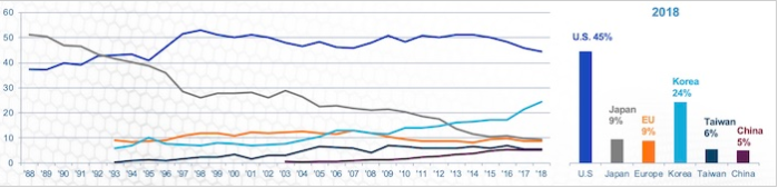 該線圖描述了1988-2018年半導(dǎo)體市場(chǎng)份額的趨勢(shì)。條形圖顯示了截至2018年的市場(chǎng)份額。圖片由SIA提供
