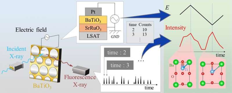 來自BaTiO_3薄膜的熒光X射線由帶有時(shí)間標(biāo)記信息的固態(tài)檢測器檢測,該時(shí)間標(biāo)記信息與薄膜上的施加電壓同步以獲得光譜的時(shí)間變化。圖片來源:廣島大學(xué)中島信男