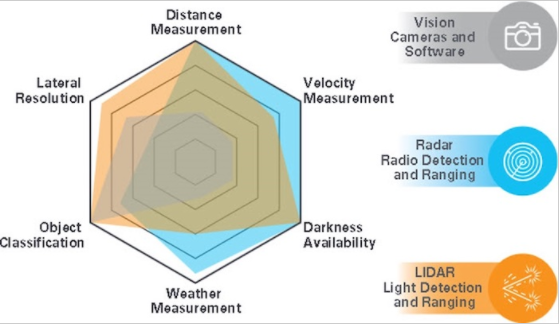 視覺、雷達(dá)和激光雷達(dá)的比較。圖片由ADI 公司提供
