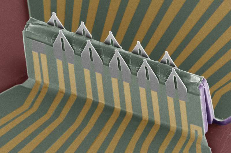 “彈出式”傳感器的 SEM 圖像,可直接測量心臟細(xì)胞內(nèi)電信號的速度和運動。