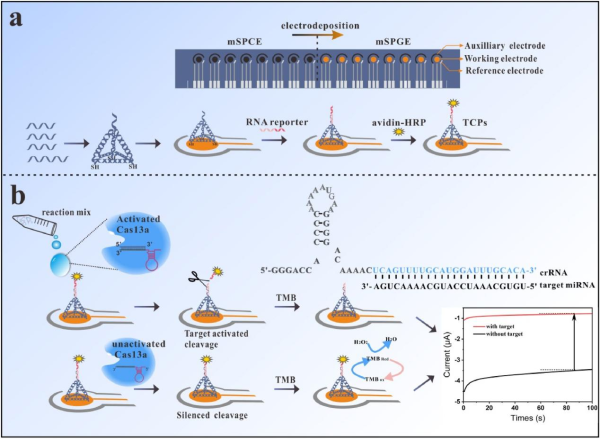 近日,中國科學院上海微系統(tǒng)與信息技術研究所研究員宓現(xiàn)強課題組構建了一種基于CRISPR的電化學傳感器(CRISPR-E)。該研究將DNA四面體框架結構修飾在印刷電極上,進一步與RNA探針雜交,最后連接HRP分子構建TCP探針;通過將電化學技術、DNA四面體框架結構與CRISPR技術相結合,利用Cas 13a在crRNA的引導下識別靶RNA后能夠?qū)捂淩NA表現(xiàn)出“附帶切割”能力,實現(xiàn)了對miRNA的無擴增、高靈敏度檢測。由于整個反應過程可以在電極上實現(xiàn),因此有望推動miRNA的及時快速(POC)檢測。