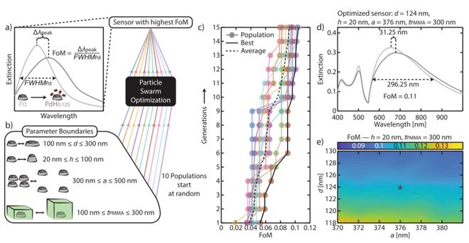 針對(duì)這一問(wèn)題,柏萍使用逆向納米光子的設(shè)計(jì)方法,并結(jié)合人工智能設(shè)計(jì)出一種超靈敏等離子體氫氣傳感器。同時(shí),該傳感器也基于鈀納米顆粒周期性陣列中的集體共振。