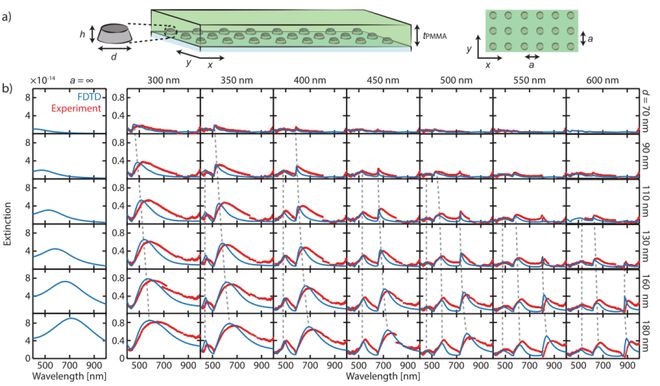 結(jié)合顆粒陣列中集體表面晶格共振的窄消光光譜特性,她和合作者以較大化傳感器的靈敏度為目的,優(yōu)化了鈀納米顆粒陣列的各項(xiàng)幾何參數(shù),比如顆粒直徑、高度、周期性陣列的晶格常數(shù)、以及覆蓋其上的過(guò)濾層厚度。