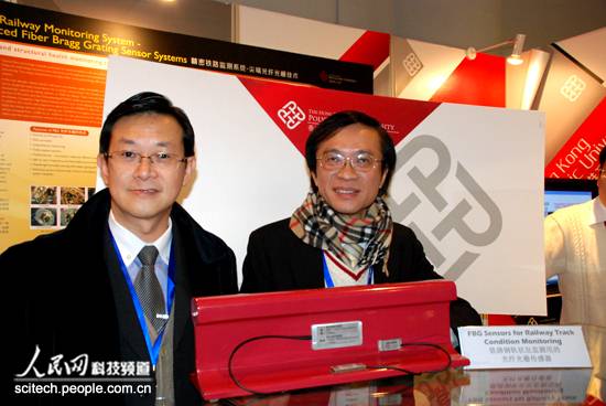 香港理工大學(xué)何兆鎏教授(右)、譚耀華教授(左)和他們的推廣產(chǎn)品光纖光柵傳感器