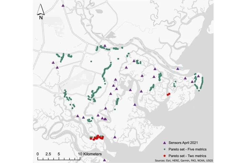 這張佐治亞州查塔姆縣的地圖顯示了新水位傳感器的潛在位置。紅點表示僅使用兩個傳統(tǒng)指標(biāo)確定的位置:填補(bǔ)網(wǎng)絡(luò)中的空白和減少由網(wǎng)絡(luò)覆蓋范圍有限引起的不確定性。綠點顯示使用Iris Tien優(yōu)化工具的潛在位置,該工具還考慮了洪水的可能性,關(guān)鍵基礎(chǔ)設(shè)施的暴露風(fēng)險和社會脆弱性指標(biāo)等其他因素。