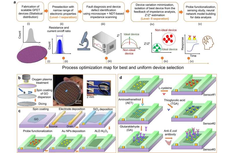石墨烯基場效應(yīng)晶體管(GFET)傳感器陣列的晶圓級納米制造和功能化。一種原理圖納米制造策略,使用阻抗測量進(jìn)行器件預(yù)選(故障診斷),以小化器件變化,以實(shí)現(xiàn)近乎理想的響應(yīng)模式。測試/分析程序的每個步驟都示意性地顯示(i-v),并在插圖中附有相應(yīng)的描述。b 將氧化石墨烯(GO)分散液旋涂到整個晶圓基板上,用于沉積圖案電極。照片顯示了切割后的晶圓尺寸傳感器器件和表面有一滴測試溶液的單個器件。c 基于rGO的FET傳感器器件的納米制造步驟包括通過電子束光刻進(jìn)行電極沉積,SiO的沉積2使用電子束光刻、3 nm 原子層沉積 (ALD) 衍生的 Al 在電極上的保護(hù)層2O3作為頂部柵極氧化物,濺射金納米顆粒(NPs)作為探針的錨定位點(diǎn),并實(shí)現(xiàn)探針功能化。d 傳感器1-3使用特定生化和抗體探針進(jìn)行探針功能化的示意圖步驟。自然通訊 (2023)。DOI: 10.1038/s41467-023-39701-0