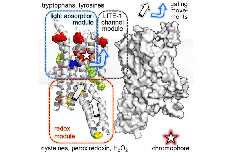 他們發(fā)現(xiàn),除其他外,形成通道的氨基酸的替換導(dǎo)致LITE-1的功能完全喪失。其他突變實驗揭示了蛋白質(zhì)可以與H相互作用的位點2O2還發(fā)現(xiàn)了一種中心氨基酸,它似乎負責吸收紫外線產(chǎn)生的能量。