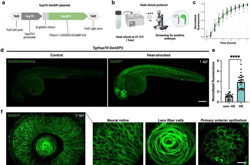 為了對(duì)這些通道進(jìn)行成像,由Periklis Pantazis博士領(lǐng)導(dǎo)的帝國理工學(xué)院研究人員開發(fā)了一種高度特異的生物傳感器GenEPi,當(dāng)Piezo1通道被激活時(shí),它會(huì)在顯微鏡下發(fā)光。他們?cè)诩?xì)胞和整個(gè)生物體水平上測試了GenEPi,成功地突出了Piezo1在人類腎臟、包皮、宮頸癌細(xì)胞、跳動(dòng)的小鼠心臟細(xì)胞和整個(gè)斑馬魚胚胎中的活性。